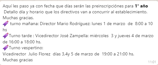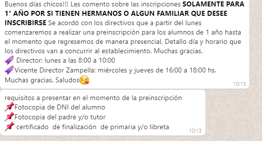 Se les comunica que a partir del de Lunes 8 se comenzara con la PREINSCRIPCION para 1er Año 2022. En el horario de 8 a 10hs Turno Mañana Y para el Turno Tarde de 14 a 16. Traer Constancia de 6to grado.
